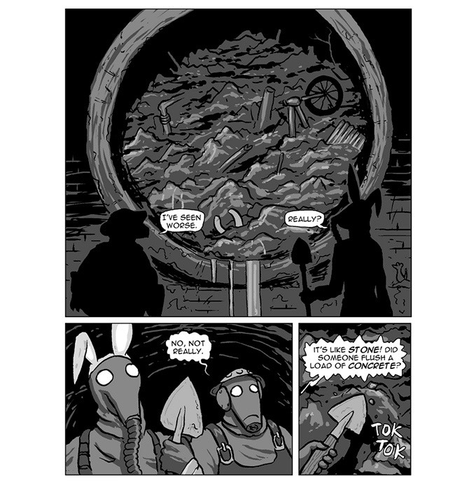 Chub and Coney are simple maintenance workers in the vast sewer system beneath a city they never see. They are overworked and filthy and live for simple pleasures such as seeing a bird, or some time off. One day, the subterranean ecosystem is thrown out of balance when a mysterious naked interloper starts causing trouble. There are plots afoot in the underground, and Chub and Coney have been given the unhappy task of clearing them away.